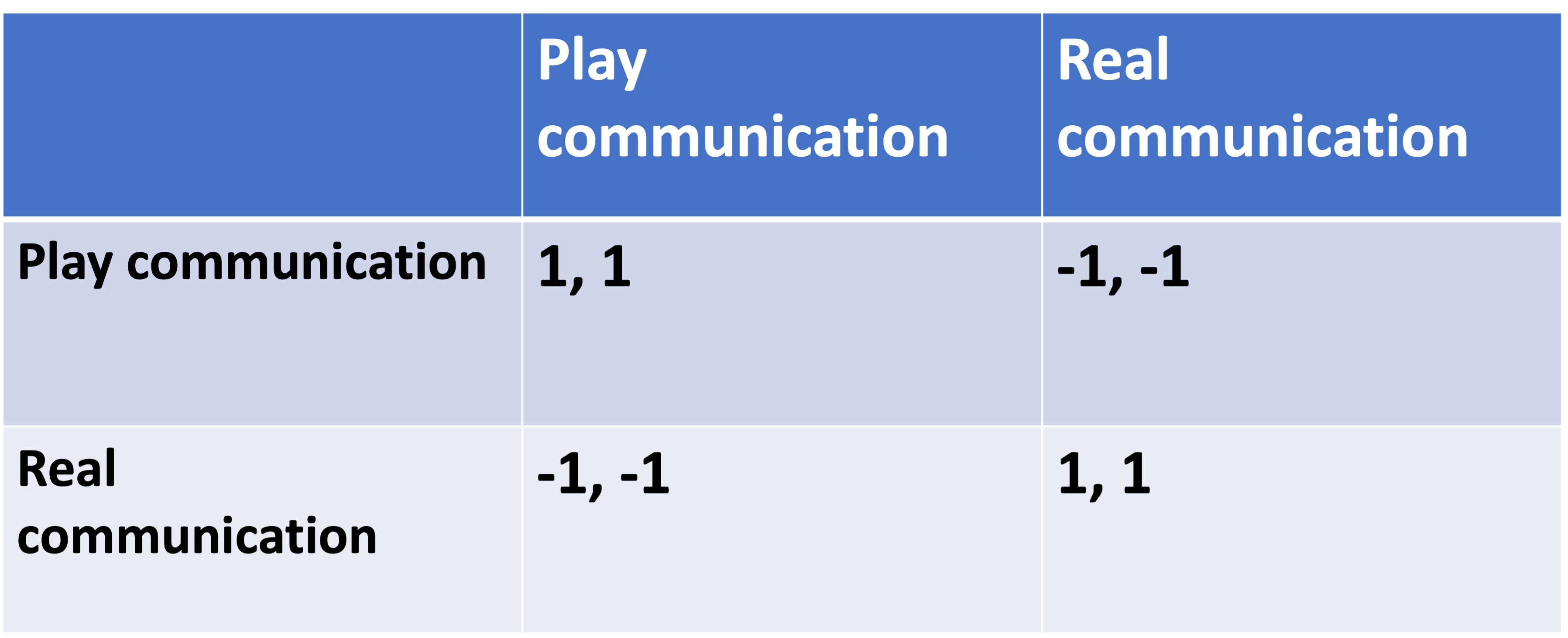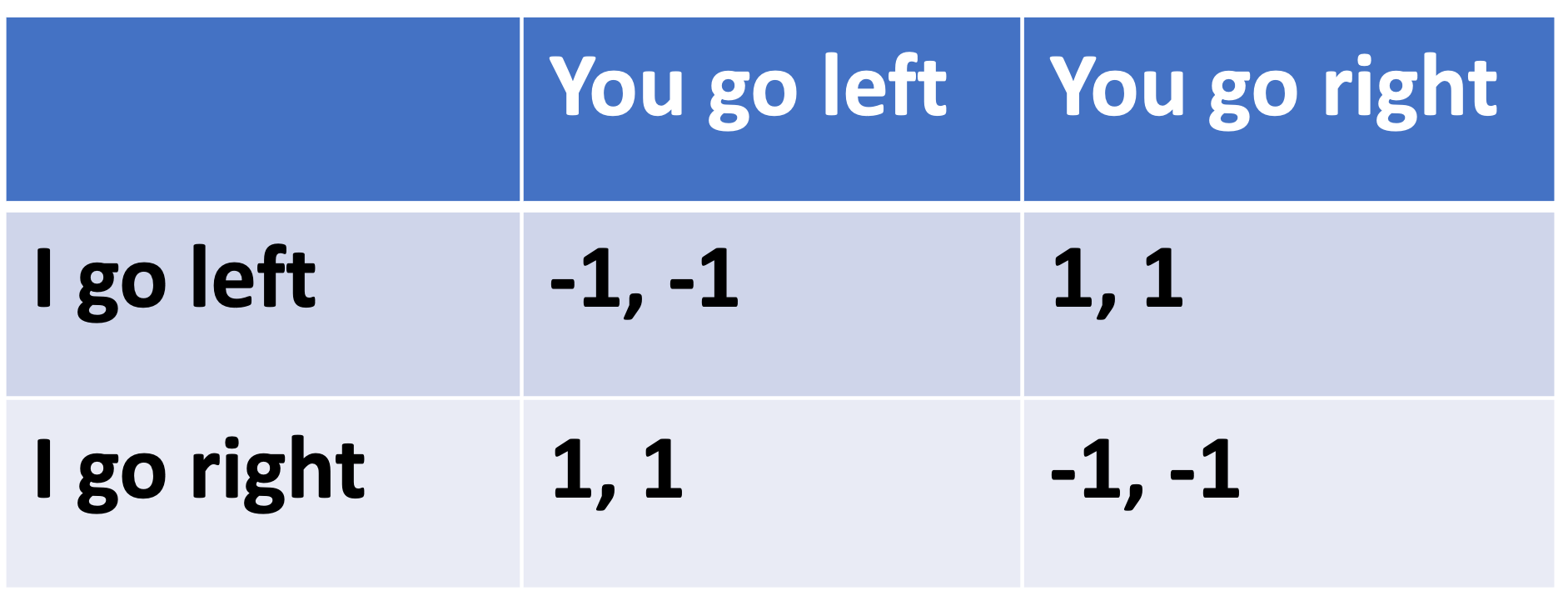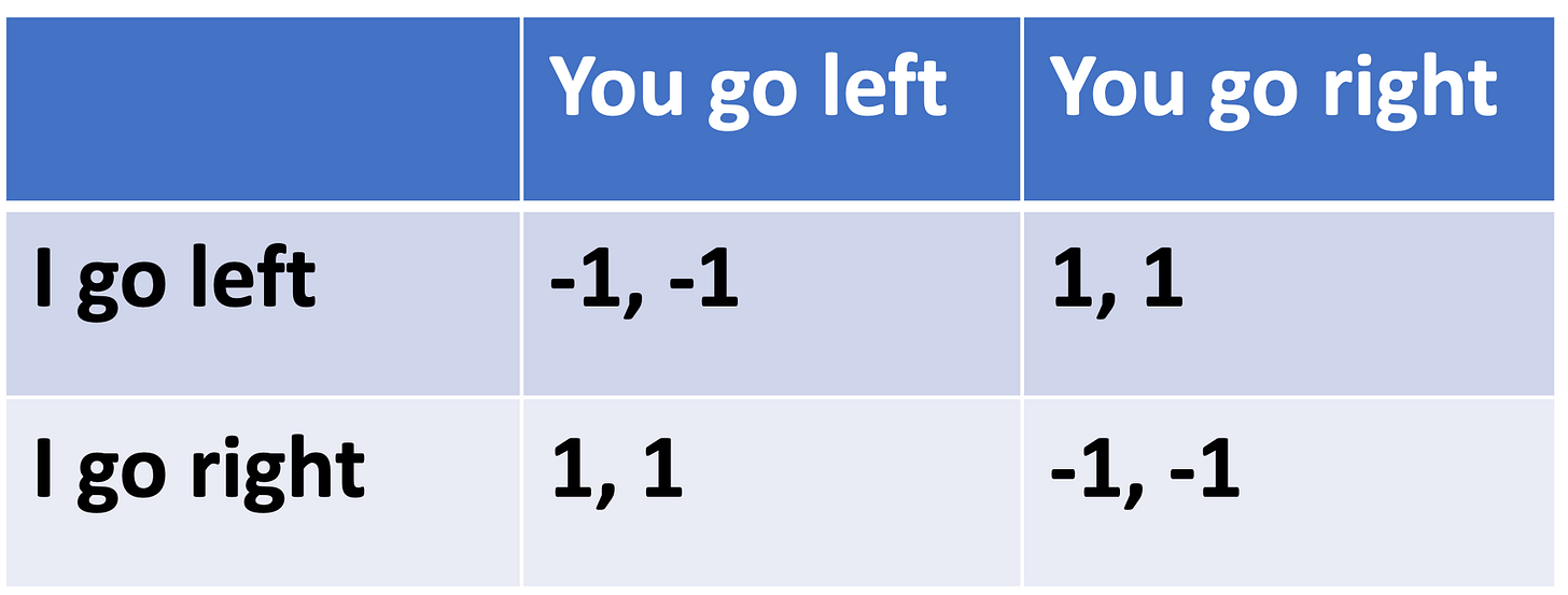 We can think of our social interactions as little games. Most of these games are coordination games, where we mutually benefit from aligning our behaviors, roles, and intentions. For example, passing each other in a hallway can be represented with the following payoff matrix:
